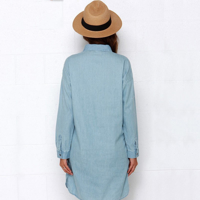 Women's Washed Denim Jean Dress Loose Casual Long Sleeve Shirt Dresses